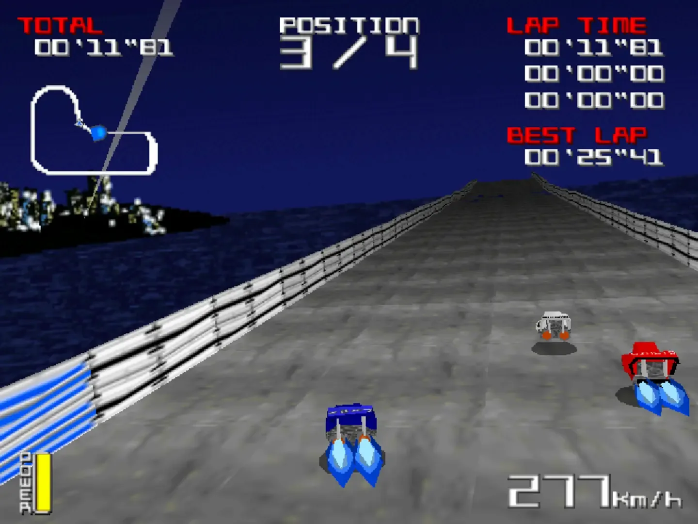 Hover Racing was created by a small team of university students led by designer Tomokazu Sato and primary composer Hiroaki Ohmori between April and November of 1997, a concise but polished clone of futuristic racing games like F-Zero X and Wipeout. The core gameplay consists of 3 Grand Prix with 3 tracks each, as well your usual practice and time attack modes.