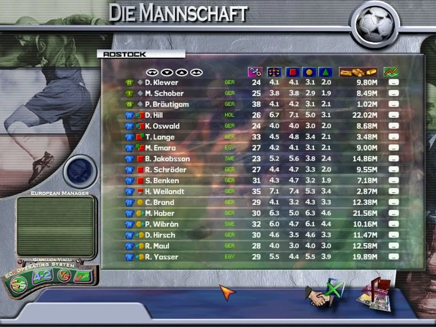 Gianluca Vialli's European Manager is a soccer management simulation in which the user embodies both the manager and coach of a football team, but with tactical as well as economical duties and responsibilities.