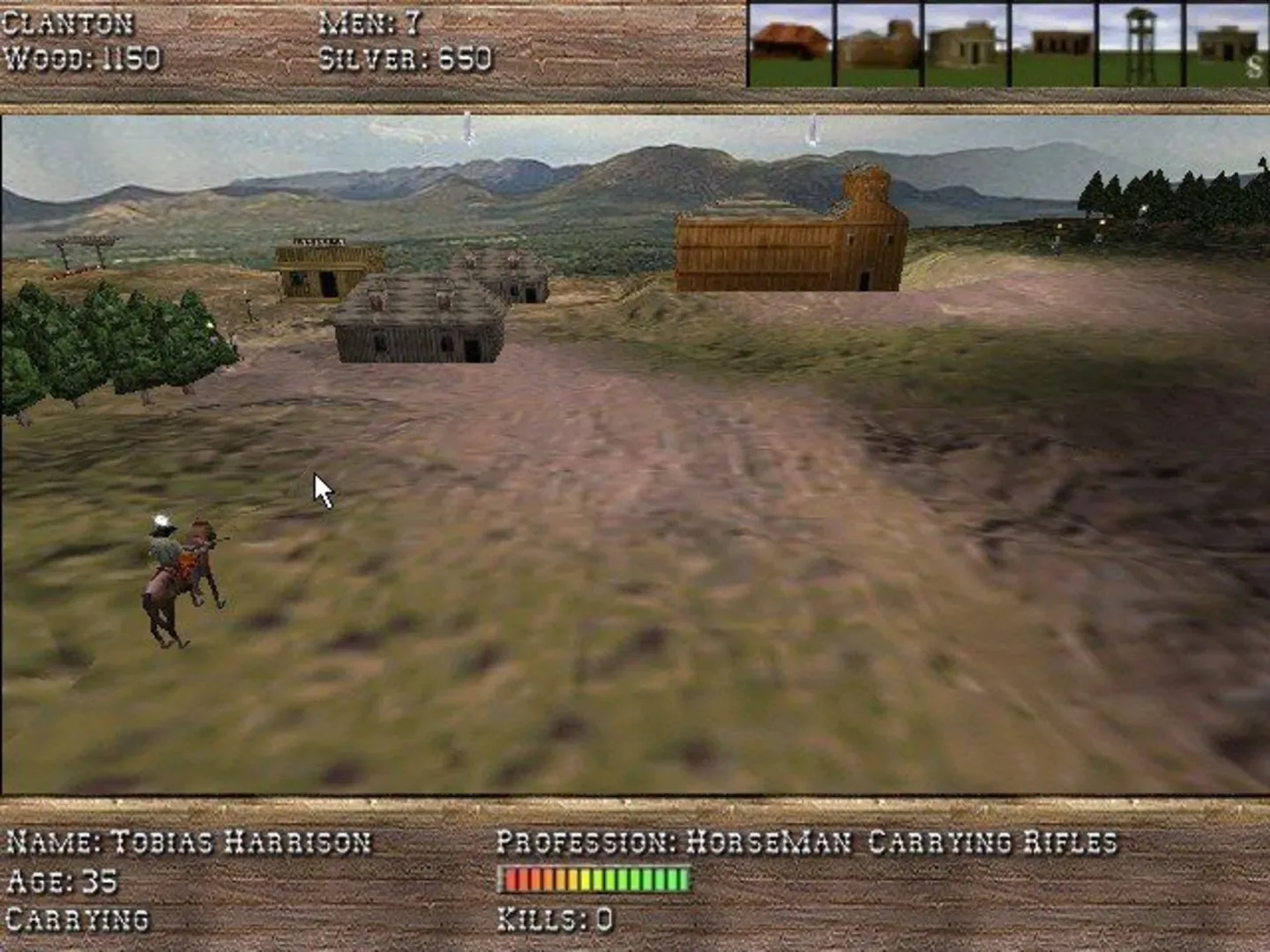 A budget priced RTS set in the wild west. Players choose a side in the famous Earp/Clanton feud and set about harvesting wood and mining silver to construct the buildings and hire the fighters needed to defeat the other. There are approximately 20 total scenarios (although all take place on the exact same map) with each side having access to the same six types of buildings and five types of units.