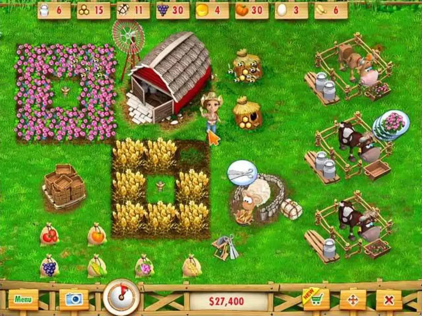 In this time-management game, you play Sara, a worker at a greenhouse. Unfortunately, the greenhouse is failing, and the owner is going to sell to a developer in eight weeks. Sara's only chance of saving the nursery is to take over a vacant three acres and turn it into a productive farm. Each week consists of five missions (where you need to harvest certain amounts of each crop) taking place on Monday through Friday, plus a Saturday farmer's market, where each item you sell gives bonus cash. Some items take more time than others to grow, and other items, such as milk, require you to take crops and process them in some way. (For example, taking clover to a cow to get milk in return, or turning tomatoes into ketchup.)