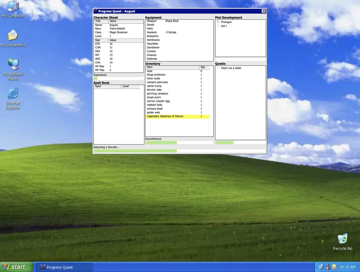 Progress Quest is a video game developed by Eric Fredricksen as a parody of EverQuest and other massively multiplayer online role-playing games. It is loosely considered a zero-player game, in the sense that once the player has set up their artificial character, there is no user interaction at all; the game "plays" itself, with the human player as spectator.