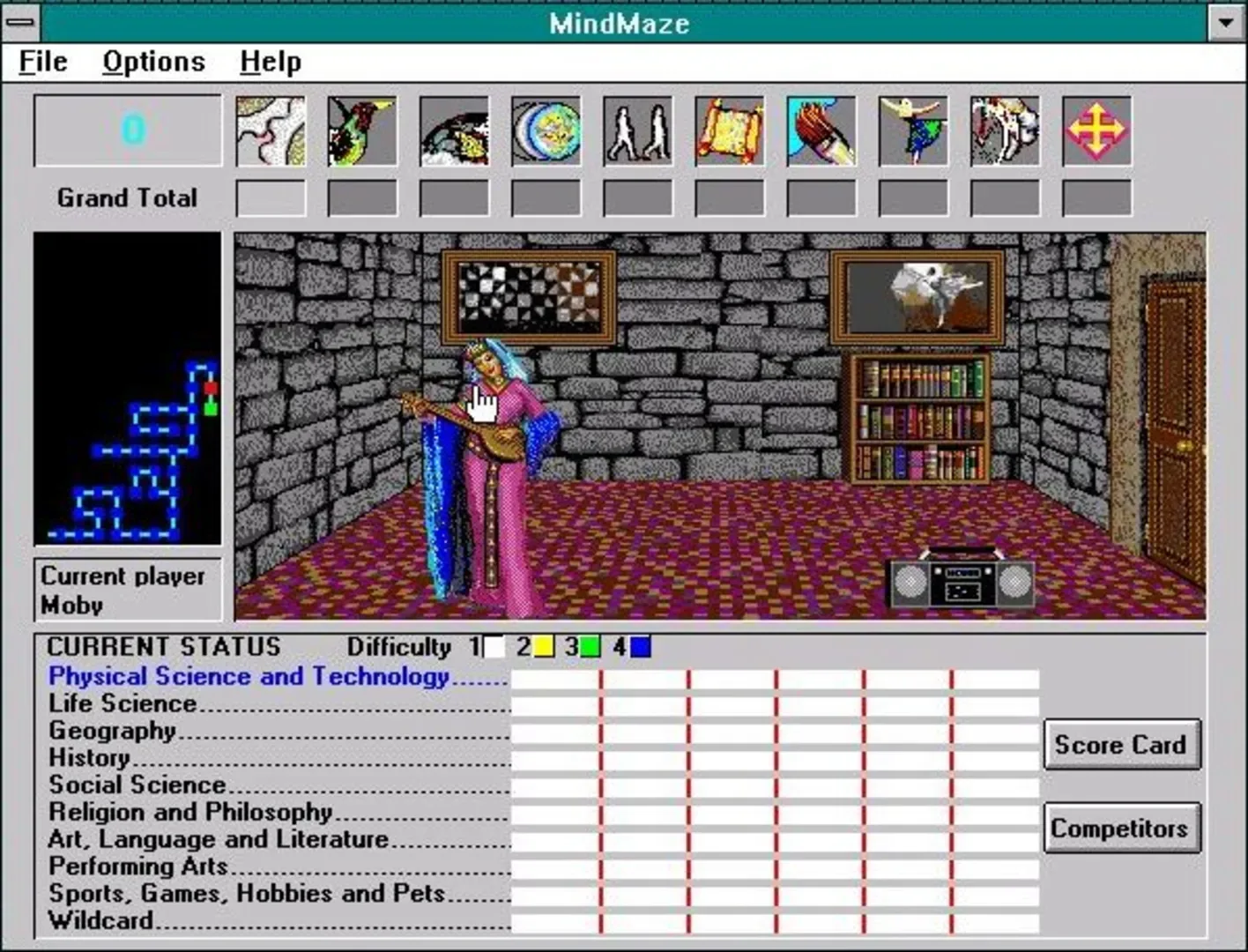 In any pre-2008 version of Microsoft Encarta, press ctrl z to start MindMaze. MindMaze is a built-in quiz shipped with pre-2008 versions of Microsoft Encarta. Players advance through a cursed castle maze, answering questions to move from room to room. The player is transported back in time to break the curse on King Miser the First's castle. The castle consists of several floors, each floor holding 100 rooms in a 10x10 grid. To unlock a door between rooms, the player must correctly answer a multiple-choice, timed trivia questions.