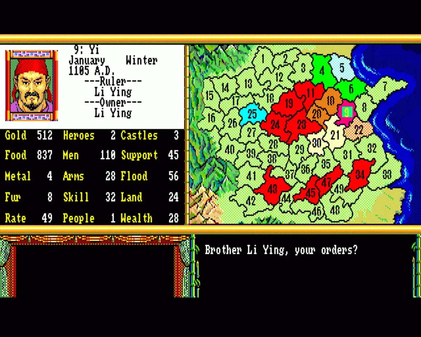 Bandit Kings of Ancient China is a turn-based strategy role-playing simulation game developed and published by Koei for MS-DOS, the Amiga, and the Apple II. It was well-received at its inception, and was considered to be a significant step forward in the complexity of strategy gaming.