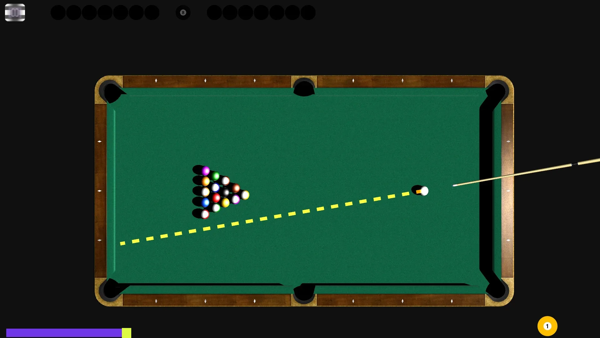 "9 Balls" is a miniature game of billiards. The control is made by the mouse vutton and the spacebar. Use the mouse to aim and change the force of the impact and the spacebar to strike the cue on the ball.