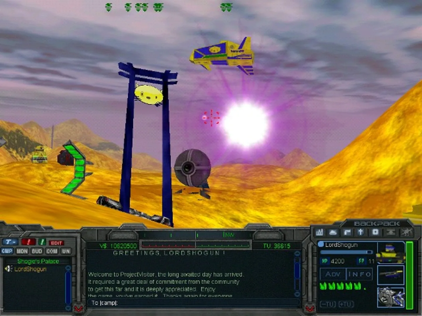 Project Visitor is, at its heart, a hybrid MMO game with both FPS and RTS characteristics. It comes from the days when we use to call them PSW's (Persistent State Worlds). Nowadays most MMO games are really just PSC (Persistent State Characters) where essentially its just your character that changes and is saved. In Project Visitor you build the world around you, you attack others and the lands they have built and the whole world is saved to the database. Also the world continues to grow and battles happen, lands are lost, gained, etc even while your offline. To maintain your land you have to be involved, join a protective group called a MDN, own, mine, defend, survive! Previously known as 10Six, it was Sega's first foray into MMO's, a persistent online RTS where players signed up for one of four mega-corporations aiming to conquer the rogue planet Visitor, which has entered the solar system and contains a treasure of valuable resources. Players construct and capture mining sites, construct defenses and NPC units to help defend and attack in a fairly traditional RTS mode, but much of the game also consists of player on player combat in first or third person modes, similar to Battlezone or Planetside. The server infrastructure was designed to be able to handle a million simultaneous players and was hosted through SegaSoft's Heat.net, but never saw player counts that high. After failing to attract a sufficiently large audience Sega shut down the game in June 2002, offering refunds to anybody with subscription time left. A community effort to relaunch the game was started soon after the servers were taken down. Conundrum Studios was formed in late 2002, and the game was relaunched under the name Project Visitor in 2003.